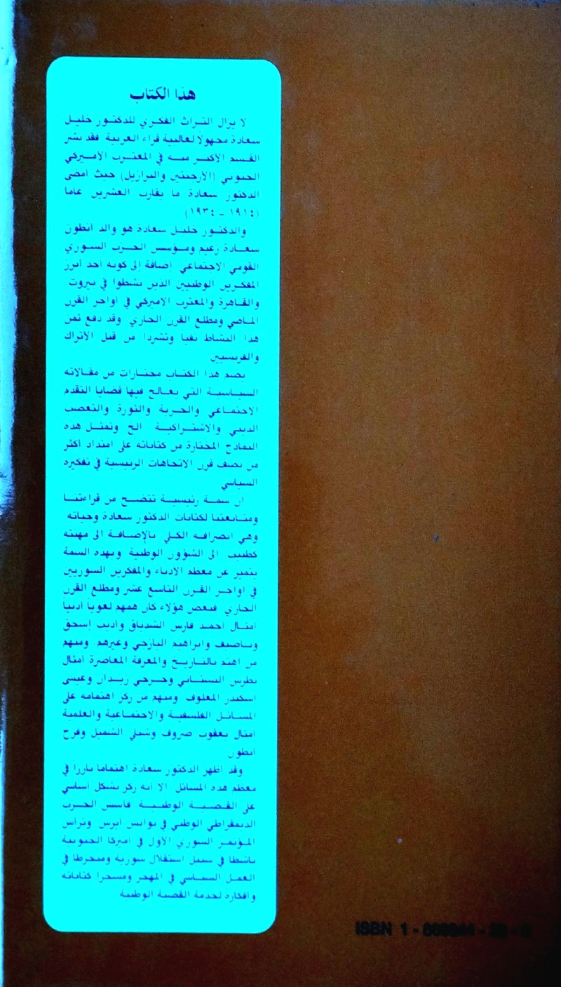 عاش الدكتور معظم حياته في القاهرة والمغترب الأمريكي الجنوبي، وكان لاحقاً من قبل الأتراك، ثم الفرنسيين. يضم هذا الكتاب مختارات أخرى من حقوق المؤلف التي لم تشترك في الوطن كسلسلة "طب الإستبداد" التي نشرتها في الأرجنتين، وأبحاث مثل "الصحافة وأية" و"التعصب داؤنا العضال" و"ارتقاء الشرق" و"صك الإنتداب".