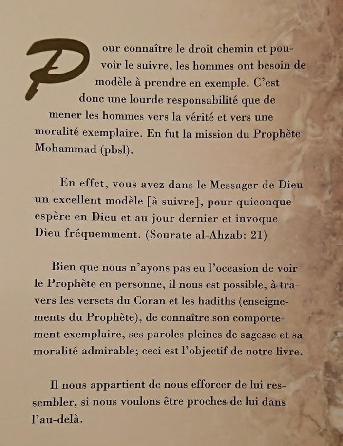 Bien que nous n'ayons pas eu l'occasion de voir le Prophète en personne, il nous est possible, à travers les versets du Coran et les hadiths (enseignements du Prophète), de connaître son comportement exemplaire, ses paroles pleines de sagesse et sa moralité admirable; ceci est l'objectif de notre livre.