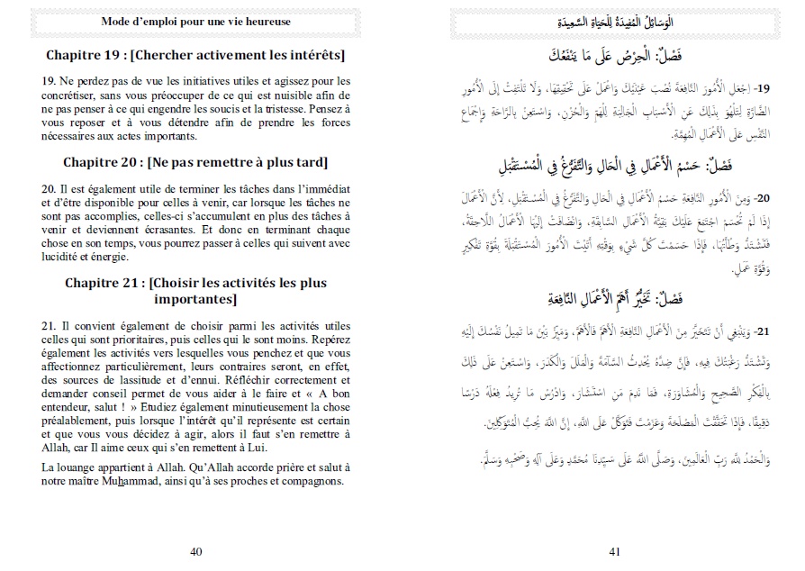 Dans cet ouvrage incontournable, le Cheikh ‘Abdu-r-Rahmân Ibn Nâsir As-Sa‘dî nous offre, à travers des enseignements tirés du Coran et de la Sunna, un guide clair et accessible pour mener une vie heureuse en mettant en avant des moyens concrets tels que la foi, l’évocation d’Allah, la reconnaissance de Ses bienfaits, l’optimisme ou encore la gestion des épreuves... Il y démontre également que ces moyens, bien qu’accessibles à tous, trouvent leur plénitude et leur profondeur chez les croyants, pour qui la foi devient une source inépuisable de paix.