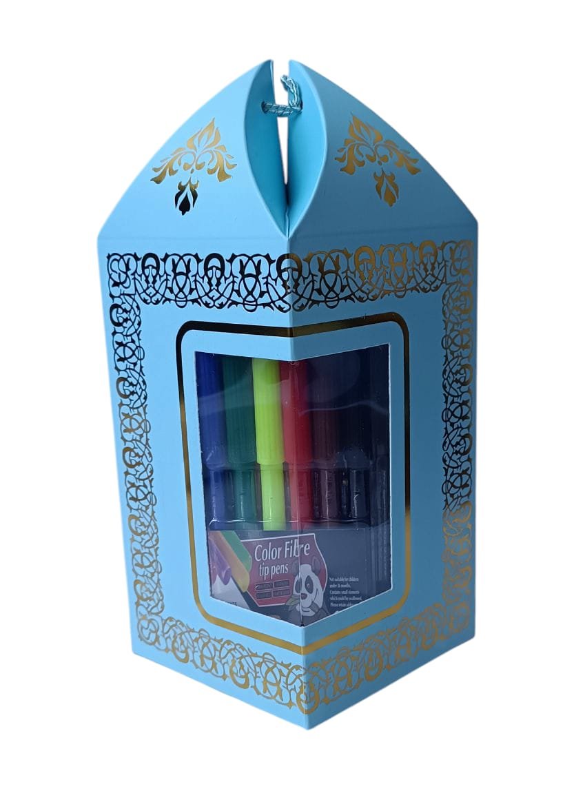 Coffret cadeau bleu doré, contenant un Tapis de prière blanc à colorier (coloriage avec feutres en couleur) pour les enfants musulmans.