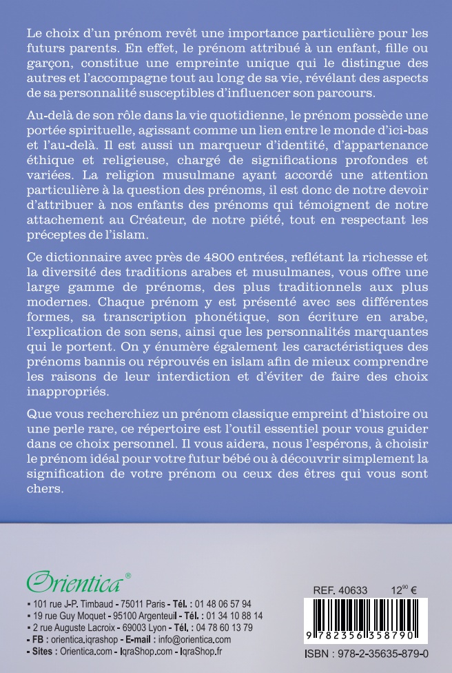 Ce dictionnaire avec près de 4800 entrées, reflétant la richesse et la diversité des traditions arabes et musulmanes, vous offre une large gamme de prénoms, des plus traditionnels aux plus modernes. Chaque prénom y est présenté avec ses différentes formes, sa transcription phonétique, son écriture en arabe, l’explication de son sens, ainsi que les personnalités marquantes qui le portent. On y énumère également les caractéristiques des prénoms bannis ou réprouvés en islam afin de mieux comprendre les raisons de leur interdiction et d’éviter de faire des choix inappropriés.