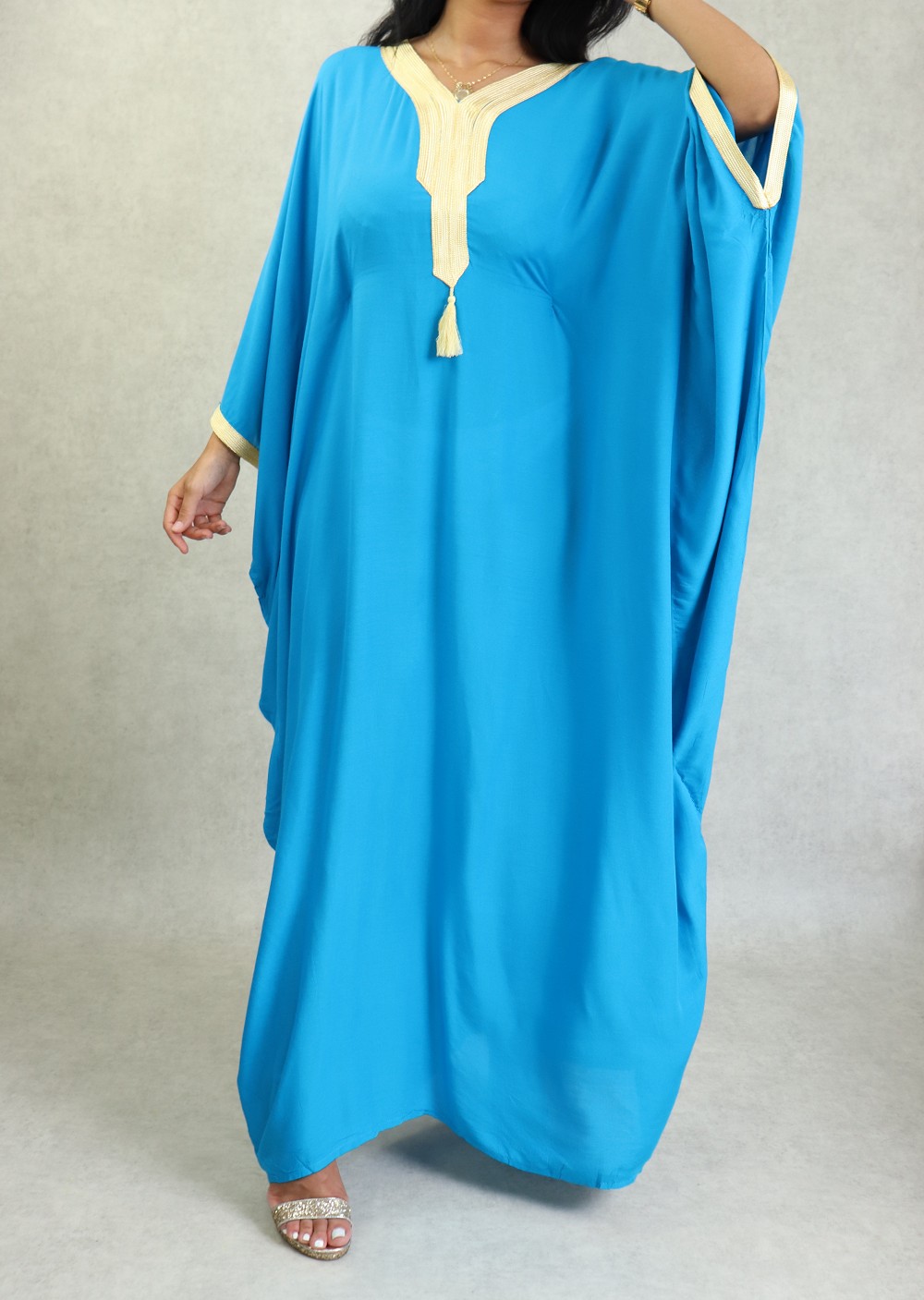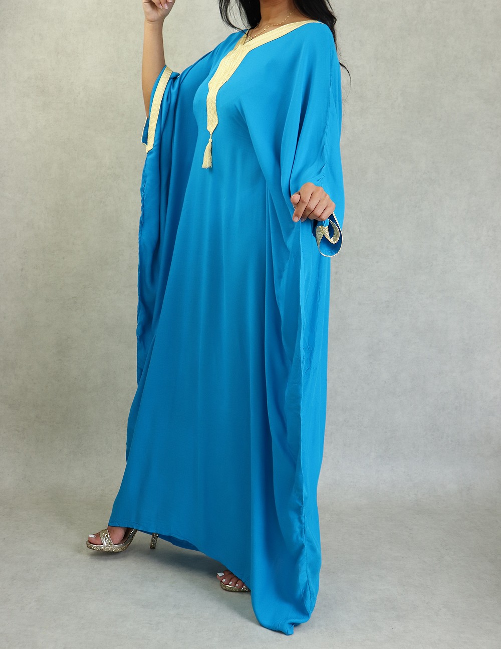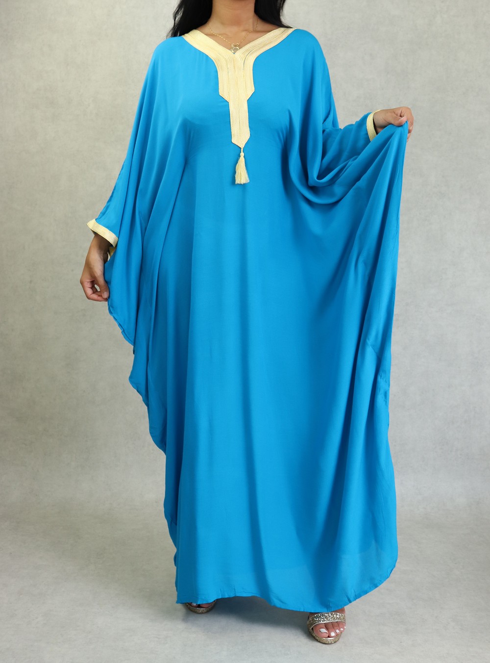 Ses manches larges et sa coupe papillon lui donnent une allure orientale. Sa couleur est sobre, elle donne le ton à la tenue.