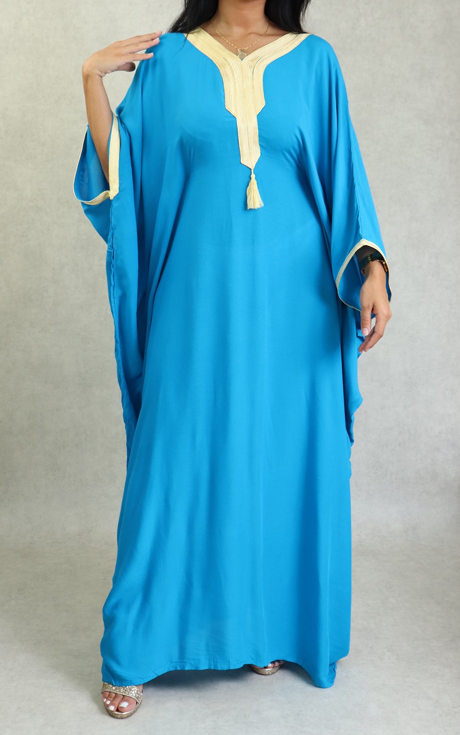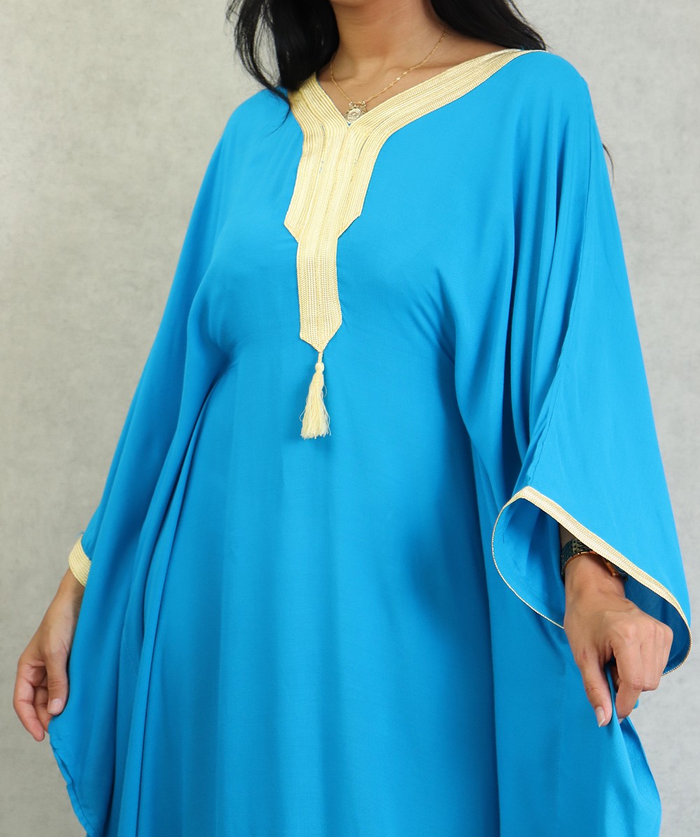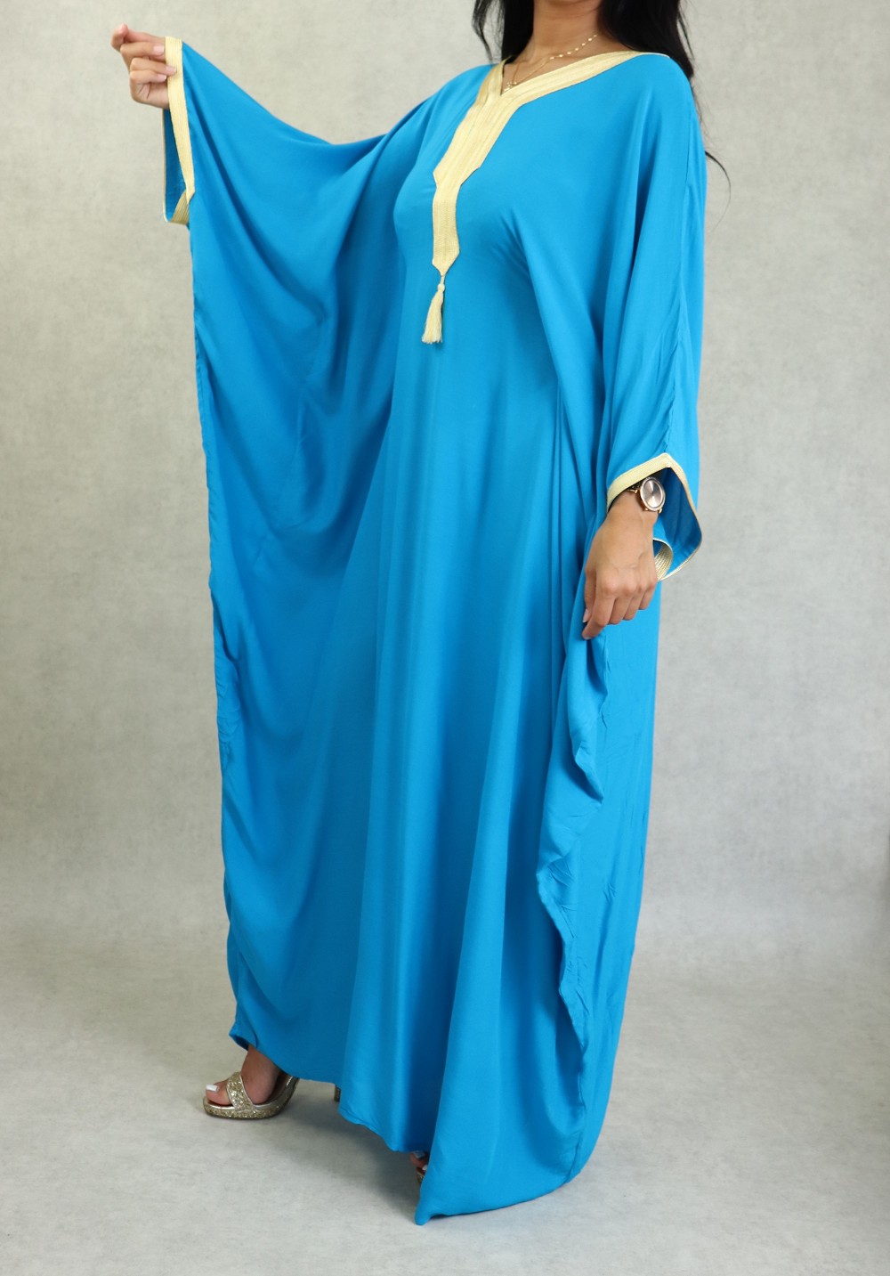 Ses manches larges et sa coupe papillon lui donnent une allure orientale. Sa couleur est sobre, elle donne le ton à la tenue.