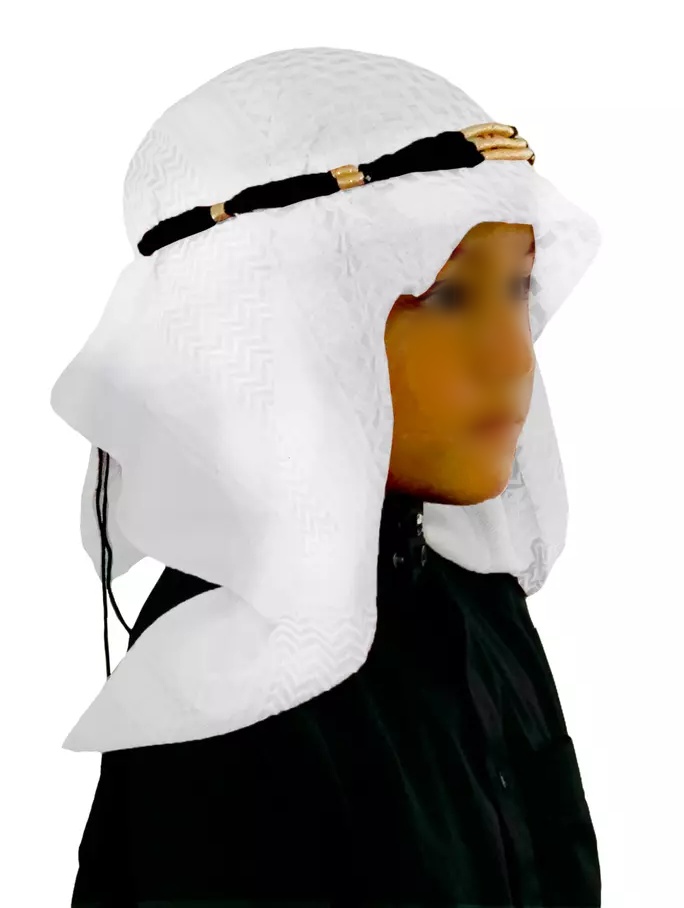 Foulard (Ghutra) blanc avec son Agal (noir doré qu'on pose sur la tête), voir photo. Taille standard pour enfant.