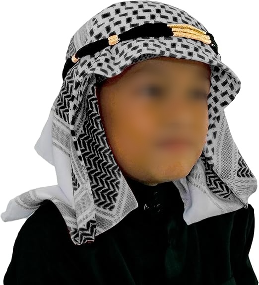 Foulard avec son agal (noir doré qu'on pose sur la tête), voir photo. Taille standard pour enfant.