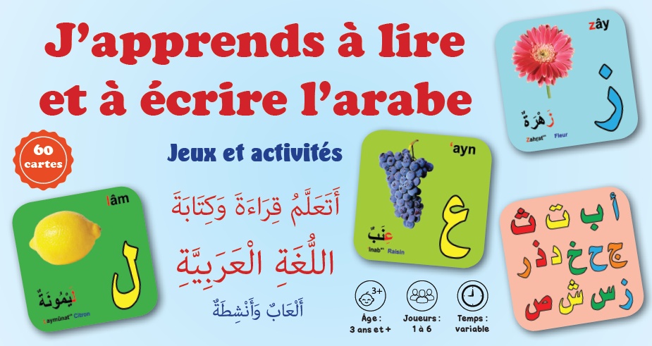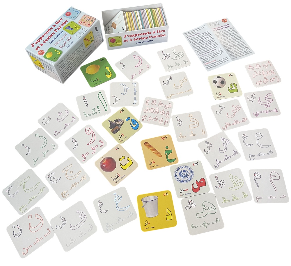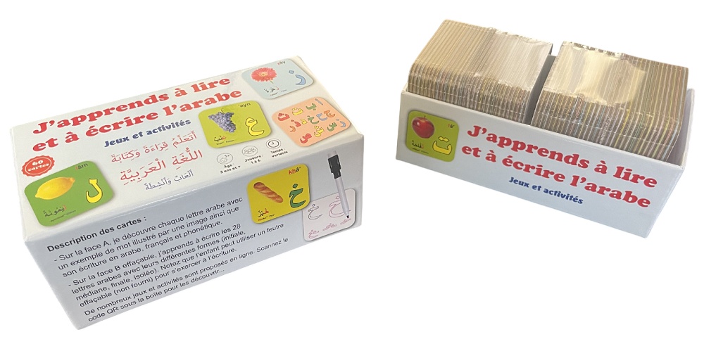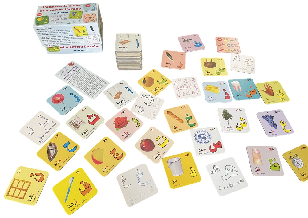 - Sur la face A, je découvre chaque lettre arabe avec un exemple de mot illustré par une image ainsi que son écriture en arabe, français et phonétique.
