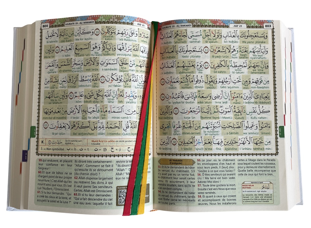 Les règles de tajwid sont données par un système de couleur intuitif pour apprendre les règles de lecture et de psalmodie du Saint Coran et le code QR (présent sur chaque page) permet d'ouvrir une vidéo sur son smartphone et d'écouter et suivre la lecture du Coran par cheikh Soudays.