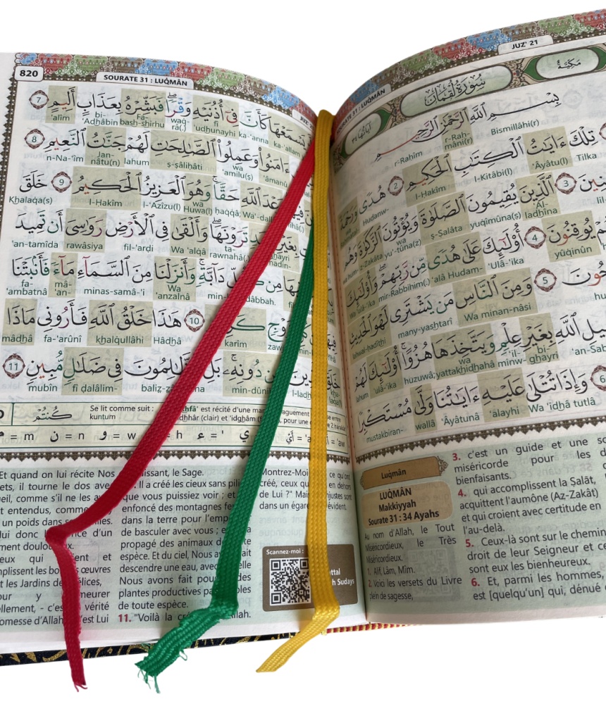 Les règles de tajwid sont données par un système de couleur intuitif pour apprendre les règles de lecture et de psalmodie du Saint Coran et le code QR (présent sur chaque page) permet d'ouvrir une vidéo sur son smartphone et d'écouter et suivre la lecture du Coran par cheikh Soudays.