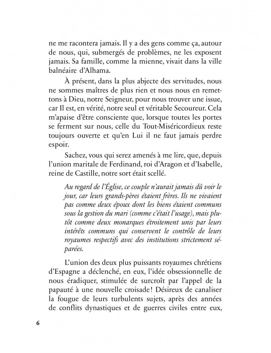 Miraculeusement préservée par la grâce d'Allah, je fus mise en servitude et déportée en Galice où, durant six ans, je vécus comme esclave, avant de pouvoir enfin m'échapper.