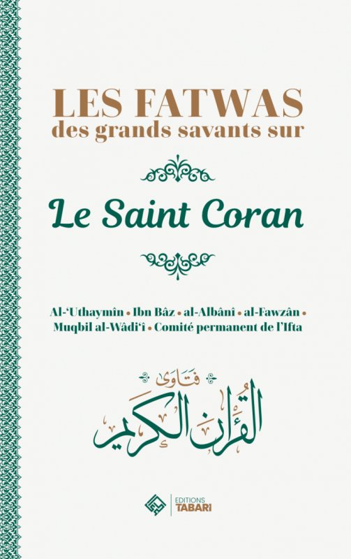 Le livre « Les Fatwas des grands savants sur le Saint Coran » rassemble les avis religieux (fatâwâ) de plusieurs érudits renommés de la ‘aqîda salafiyya concernant la lecture, la compréhension et le respect du Livre d’Allah. Cette compilation, publiée par les Éditions Tabari, met en lumière les conseils et recommandations de Cheikh Ibn Bâz, Cheikh al-‘Uthaymîn, Cheikh al-Fawzân, Cheikh al-Albânî, Cheikh Muqbil al-Wâdi‘î ainsi que du Comité permanent de l’Iftâ.