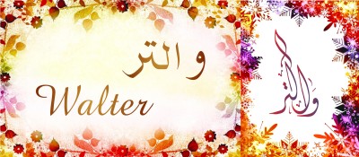 Mug avec le prénom "Walter" écrit en français, en arabe (والتر) et calligraphié de façon artistique en arabe sur la partie droite.