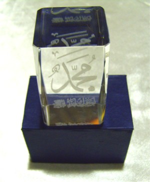 Objet decoratif en cristal avec inscription du nom du Prophete Mohammed Rassoul-Allah (saw) grave en 3D