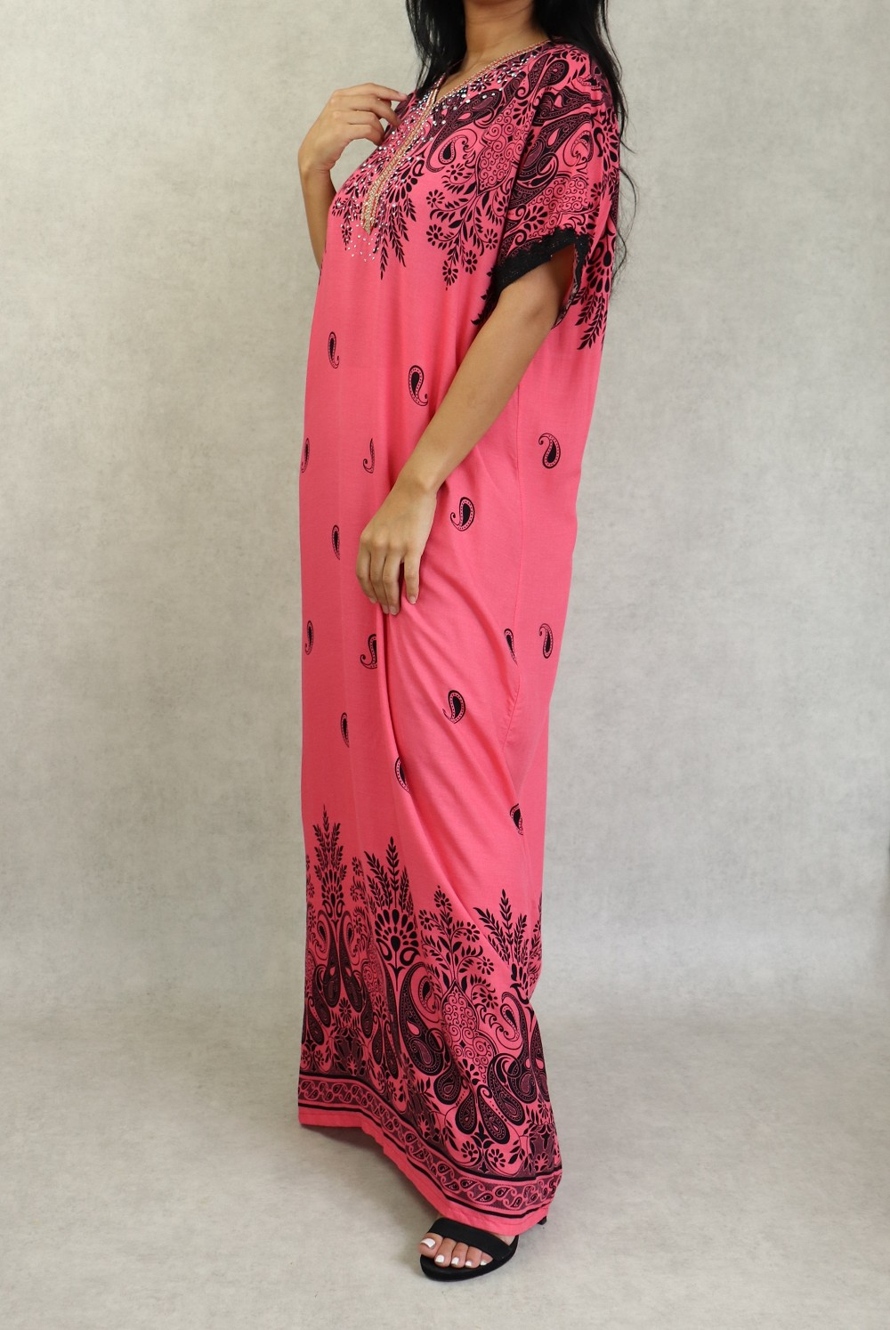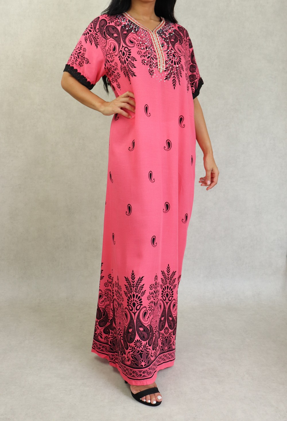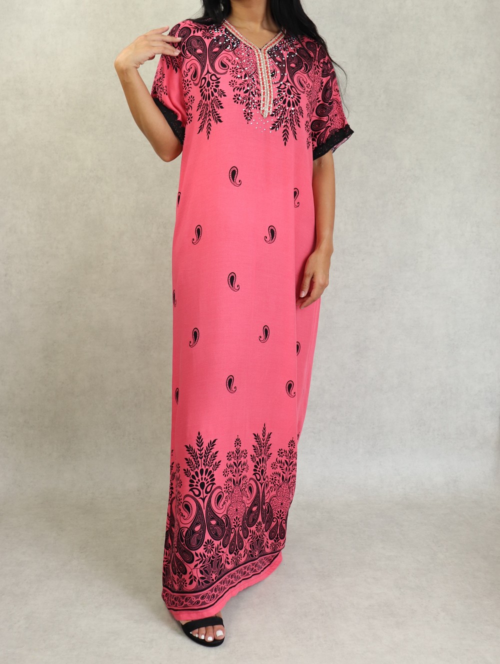 Robe longue avec strasse sur le buste, col en V, manches courte finition broderie. Coupe droite, tissu doux et fluide.