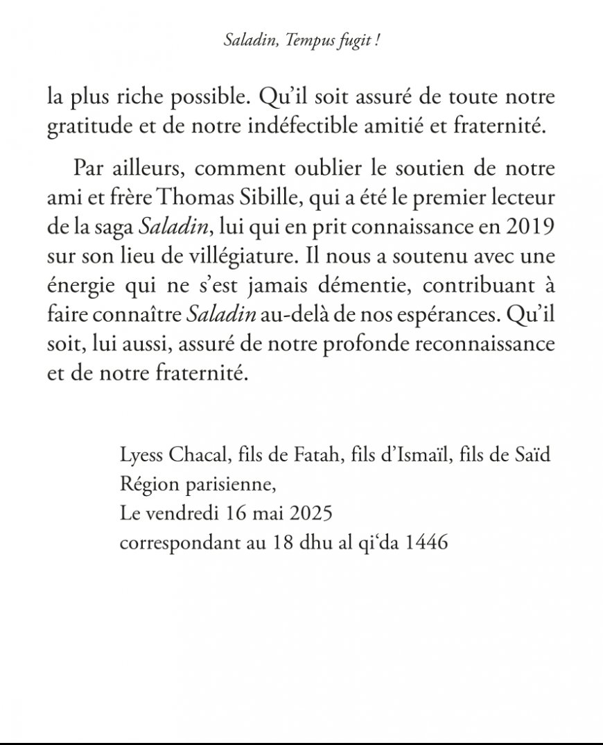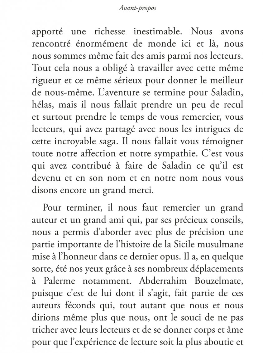 Ce dernier tome, fait de rebondissements aussi déroutants les uns que les autres, amènera le lecteur à apprécier une dernière fois la façon dont l’auteur brouille les pistes avant de révéler toute la profondeur d’un récit qui consacre non seulement la riche histoire de la présence musulmane en Sicile mais aussi et surtout le parcours initiatique auquel Saladin a été soumis tout au long de ces années avant d’être adoubé par ses pairs. Récit à la fois riche et tumultueux, Saladin aura une énième fois maille à partir avec Madame Vincent, son ex-enseignante d’histoire qui, décidément, tentera toujours de lui causer de sérieux tracas.