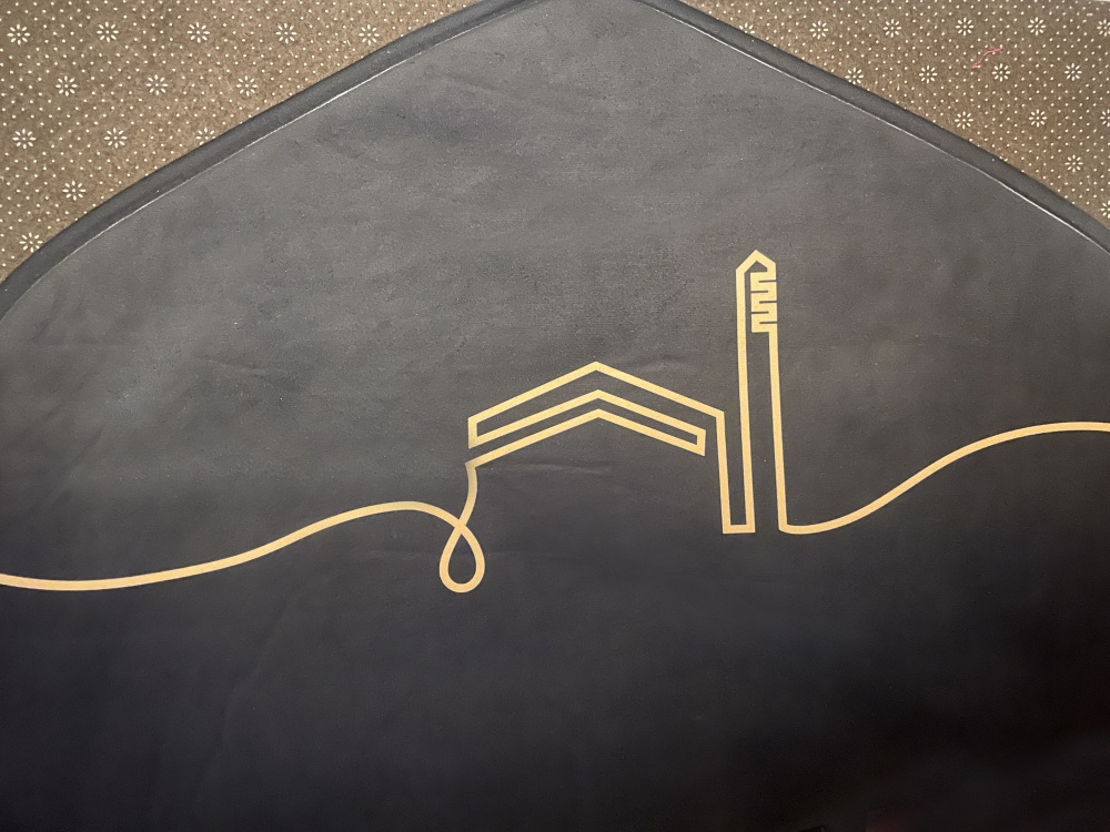 Tapis de prière Noir rembourré sous forme de Mihrab de mosquée avec motif illustratif original de la Kaaba. Dessous antidérapant. Adapté aux adultes et ados.