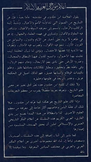 وإذا كان علم التاريخ هو هكذا كما عرّفه ابن خلدون، فلا شك أن عامة الناس وخاصتهم أكثر حاجة إلى معرفته من معظم العلوم الأخرى. لذا وانطلاقا من هذا المبدأ نضع بين يدي القارئ، العربي الكريم، هذه السلسلة عن أعلام الفكر التاريخي العربي والإسلامي أملين أن نحقق الهذف المنشود من إصدارها.