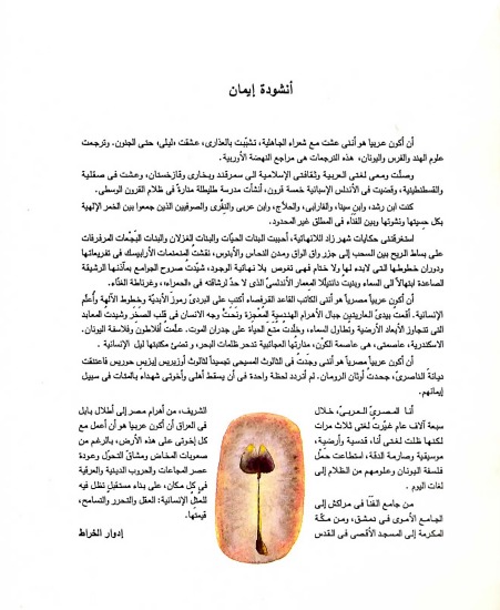 أن أكون عربيا هو أنني عشت مع شعراء الجاهلية، تشببت بالعذارى عشقت "ليلى" حتى الجنون. وترجمت علوم الهند والفرس واليونان، هذه الترجمات هى مراجع النهضة الأوربية. وصلت ومعي لغتي العربية وثقافتي الإسلامية إلى سمرقند ويخاري وقازحستان، وعشت في صقلية والقسطنطينية، وقضيت في الأندلس الإسبانية خمسة قرون، أنشأت مدرسة طليطلة منارة في ظلام القرون الوسطى. كنت ابن رشد وابن سينا والفارابي والحلاج وابن عربي والنقري والصوفيين الذين جمعوا بين الخمر الإلهية بكل حسيتها ونشوتها وبين الفناء في المطلق غير المحدود