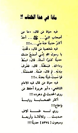 ماذا في هذا الكتاب؟ فيه حياة من قال: "ما من أصحاب النبي صلى الله عليه وسلم أحد أكثر حديثا عنه مني". فيه شخصية من قال: "قلت يا رسول الله إني أسمع منك حديثا كثيرا أنساه. قال: ابسط رداءك فبسطته. قال فغرق بيده. ثم قال: ضمه. فضممته. فما نسيت شيئا بعده."