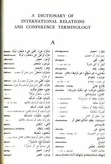 ذلك فإنه وكلما ارتقت إحدى اللغات إلى مرتبة اللغة الدولية؛ أصبح من الضروري وضع مصطلحات جديدة للمؤتمرات بتلك اللغة. ويعد "قاموس مصطلحات العلاقات والمؤتمرات الدولية" الذي نقلب صفحاته والذي وضعه الأستاذ حسن عبد الله من المساهمات القيمة في هذا الجهد المتصل.
