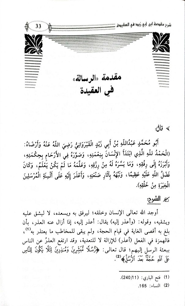 ألف علماء السنة قديما وحديثا مؤلفات توضح عقيدة أهل السنة والحديث، منها ما هو مختصر ومنها ما هو مطول، وكان من بين هذه المختصرات مقدمة الرسالة للإمام ابن أبي زيد القيرواني المالكي. وهذه الرسالة جمع فيها الإمام رحمه الله بين الأصول والفروع فجعل المشتغل في فقه العبادات والمعاملات على علم بأمر العقيدة والتوحيد. وقد قام مفتي الديار الليبية الصادق الغرياني بشرح هذه الرسالة القيّمة واضعاً شرحه بين أيديكم.