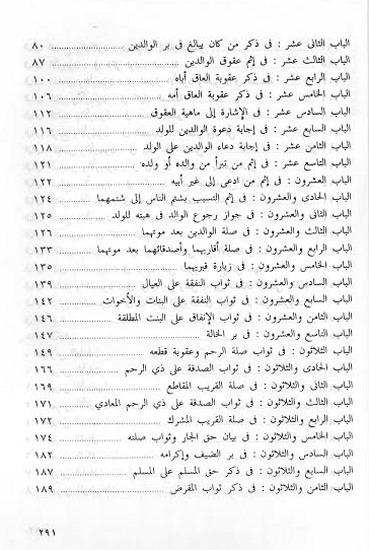 وهذا الكتاب يتضمن أربع وخمسون نذكر منها: الباب الأول: في ذكر المعقول في بر الوالدين وصلة الرَّحِم، الباب السابع: في كيفية البر للوالدين، الباب السادس عشر: في ذكر ماهية العقوق، الباب الحادي والعشرون: في إثم التسبب بشتم الناس إلى شتمهما، الباب السادس والعشرون: في ثواب النفقة على العيال؛ الباب الخمسون: في كفالة اليتيم، الباب الرابع والخمسون: في أنّ أهل المعروف في الدنيا هم أهل المعروف في الآخرة.