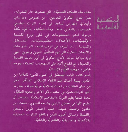 عن مقدّمة الناشر: "إتّسم كتاب "لباب المحصّل في أصول الدين" للعلّامة ابن خلدون بسِمة أعمال علم الكلام الإسلاميّ المتأخّر. فعبّر عن معانٍ انطلقت من نبعات إسلاميّة عربيّة صرفة، بمثل ما أظهر قدرات متميّزة في استقبال فكر الآخر وحججه العقليّة، بعدما طبعها بطبع العربيّة والمفاهيم الإسلاميّة. وشاءت أن تنضج كلّها في محصّل الرازي وشرحه للساوي، فبلغت ابن خلدون واضحة عميقة، عقب اختمار طويل بالمنطق والفلسفة ومسائل أصول الدين وتقاطع التيّارات المعتزليّة والأشعريّة والماتريديّة والظاهريّة والباطنيّة".