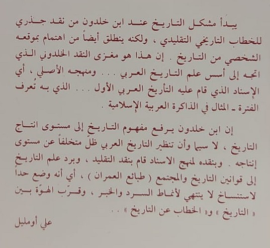 إن ابن خلدون يرفع مفهوم التاريخ إلى مستوى إنتاج التاريخ، لا سيما تنظير التاريخ العربي ظلّ متخلفاً عن مستوى إنتاجه. وبنقده لمنهج الإسناد قام بنقد التقليد، وبرد علم التاريخ إلى قوانين التاريخ والمجتمع (طبائع العمران)، أي أنه وضع حداً لاستنساخ لا ينتهي لأنماط السرد والخبر، وقرب الهوّة بين "التاريخ" و"الخطاب عن التاريخ".