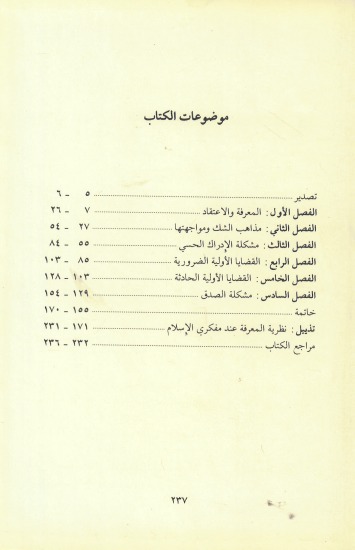 والكتاب الذي نحن بصدده يتناول نظرية المعرفة تناولات نقدياً ويعرض لجميع جوانبها وهو يحوي ستة فصول. يبحث الفصل الأول في طبيعة المعرفة والاعتقاد حيث يختلف الفلاسفة في تحديد طبيعة المعرفة. بينما يتناول الفصل الثاني مواقف الفلاسفة الذي تصدوا لمذهب الشكاك وفندوا حججهم. وبالانتقال إلى الفصل الثالث نلاحظ أنه يعرض لمشكلة الإدراك الحسي وهو المنهج الذي يبدأ به كل فيلسوف تعنيه نظرية المعرفة. وقد اعتمده كل الفلاسفة على حد وساء والفرق بينهم في درجة الثقة بالمعرفة التي تكتسب بطريق الإدراك الحسي.