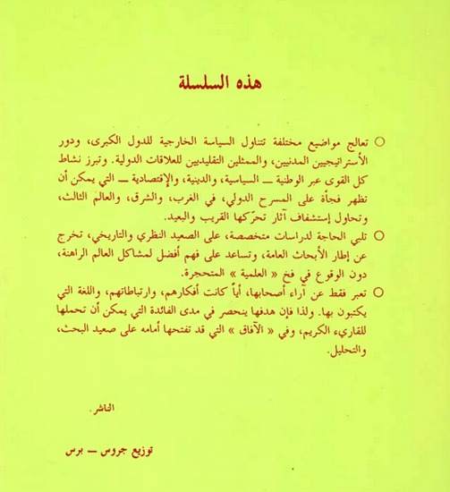 تعالج هذه السلسلة مواضيع مختلفة تتناول السياسة الخارجية للدول الكبرى، ودور الأستراتيجيين المدنيين، والممثلين التقلديين للعلاقات الدولية. وتبرز نشاط كل القوى عبر الوطنية - السياسية، والدينية، والإقتصادية - التي يمكن أن تظهر فجأة على المسرح الدولي، في الغرب، والشرق، والعالم الثالث، وتحاول إستشفاف آثار تحركها القريب والبعيد.