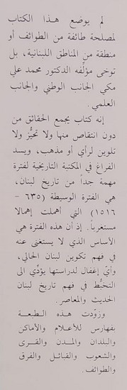 لم يوضع هذا الكتاب لمصلحة طائفة من الطوائف أو منطقة من المناطق اللبنانية بل توخى المؤلف الجانب الوطني و الجانب العلمي.