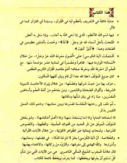 قدم المؤلف ذلك التأمين الرباني الجليل, الكافي المستمر, مستخلصاً من آية الكرسي العظيمة, معززاً ومؤيداً بالأدلة الشرعية التينة, بالآيات الكريمة, والأحاديث الصحيحة, والتجارب الإيمانية الصادقة.