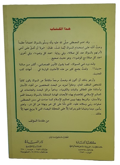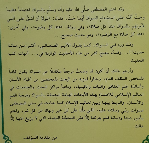 هذا هو الكتاب الثاني من سلسلة سنن الفطرة، وقد ناقش المؤلف في الفصل الأول السواك في اللغة وفي الشعر، وفيه تعريف السواك وما يستاك به، وما يستحب وما يكره. والفصل الثاني من الكتاب يعرض لنا السواك في الأحاديث النبوية، وقد ورد في السواك كما يقول الأمير الصنعاني أكثر من مائة حديث، وأما الفصل الثالث لفوائد السواك كما جاءت بها الأحاديث النبوية وهي تعتبر استكمالًا للفصل الذي قبله. وخصص المؤلف الفصل الرابع لأحكام السواك في الفقه الإسلامي وهو سنة أم واجب؟ والفصل الخامس من الكتاب لتركيب و وظائف الأسنان واللثة واللعاب وأهمية ذلك وكيف خلق الله سبحانه وتعالى هذه الأسنان الجميلة المنظر القوية البديعة التركيب. وأما الفصل السادس من الكتاب تناول فيه نخر الأسنان أو تسوس الأسنان وأسباب ذلك والوقاية منه، والفصل السابع لأمراضة اللثة والحفر والنساع، وأسباب ذلك والوقاية منه، وجعل الفصل الثامن والتاسع للحديث عن عود الأراك في الطب، وحدثنا عن السواك من أشجار أخرى غير الأراك.