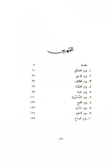 وطبيعي أننا لا نعني باليوم هنا, الوحدة الزمنية المتمثلة في أربع وعشرين ساعة, وإن طابق ذلك أكثر الأيام التي اخترناها.. إنما نعني باليوم- الظرف التاريخي للمناسبة أو الواقعة التي تشد انتباهنا وإصغاءنا. سواء تمثل هذا الظرف في يوم واحد, أو تمثل في بضعة أيام؛ فالوعاء الزمني للموقف المختار هو اليوم الذي نتابع أحداثه الجليلة مطالعين من خلالها وخلاله أروع ما عرف البشر من جلال النسك, وعظمة القصد, واستقامة السبيل. وهذه الأيام هي [يوم التحكيم, يوم الوحي, يوم الطائف, يوم العقبة, يوم حمزة, يوم الحديبية, يوم الفتح, يوم حنين, يوم التخيير, يوم الوداع].