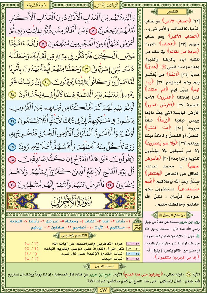 ثانياً: في السابق كان يتوجب على القارئ للقرآن الكريم وبعد قراءة الآيات القرآنية العودة إلى الكتب التفسيرية وكتب الفقه وكتب أسباب النزول لمعرفة كل ما يتعلق بتفسير الآيات المقروءة، إضافة إلى كثرة المراجع وتعددها والبحث بها، وأما من خلال هذا الابتكار الجديد والغير مسبوق يستطيع القارئ اختصار الزمن والجهد حيث يجد كل ما يحتاج إليه من معرفة وفهم للآيات على هامش الصحيفة القرآنية بطريقة جديدة ومميزة ومتقنة حيث تجعل القارئ حافظاً متقناً لمعنى الآيات وللمفردات ولأسباب النزول وغيرها في الهامش.