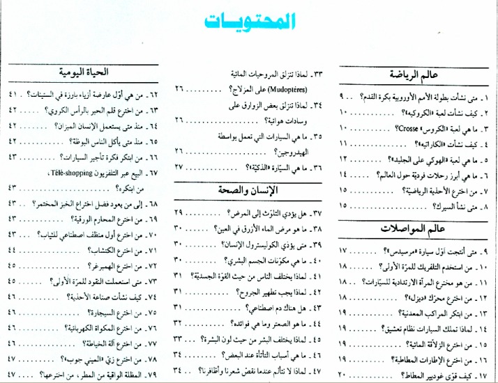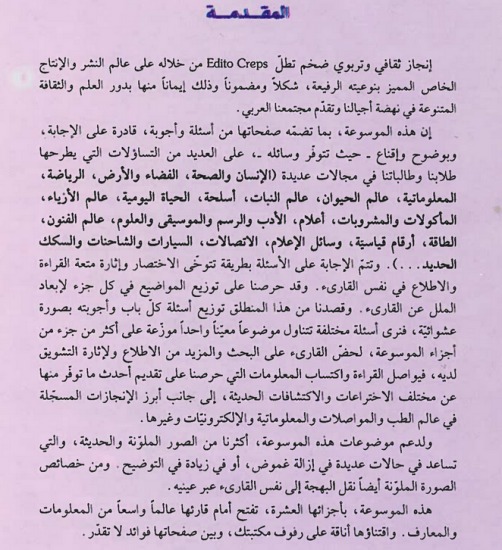 إن هذه الموسوعة، بما تضمه صفحاتها من أسئلة وأجوبة، قادرة على الإجابة، وبوضوح وإقناع على العديد من التساؤلات التي يطرحها طلابنا وطالبتنا في مجالات عديدة (الإنسان والصحة، الفضاء والأرض، عالم النبات، الحياة اليومية، عالم الفنون، وسائل الإعلام، السيارات والشاحنات...). وتتم الإجابة على الأسئلة بطريقة تتوخى الاختصار وإثارة متعة القراءة والاطلاع في نفس القارئ. وقد حرصنا على توزيع المواضيع في كل جزء لإبعاد الملل عن القارئ. وقصدنا من هذا المنطلق توزيع أسئلة كل باب وأجوبته بصورة عشوائية، فنرى أسئلة مختلفة تتناول موضوعا معينا واحدا موزعة على أكثر من جزء من أجزاء الموسوعة، لحضّ القارئ على البحث والمزيد من الاطلاع ولإثارة التشويق لديه، فيواصل القراءة واكتساب المعلومات التي حرصنا على تقديم أحدث ما توفر منها عن مختلف الاختراعات والاكتشافات الحديثة، إلى جانب أبرز الإنجازات المسجلة في عالم الطب والمواصلات والمعلوماتية والإلكترونيات وغيرها.