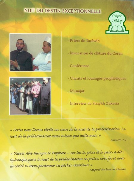 Prière de Tarawih, Invocations de clôture du Coran, Conférence, Chants et louanges prophétiques (Mohammed Hayanne), Munajat (Rachid Nasri), Interview de Shaykh Zakaria Seddiki.