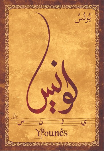 Jolie carte postale représentant le prénom arabe Younes calligraphié en arabe ainsi que son épellation lettre par lettre en arabe. Derrière la carte postale se trouve la signification du prénom.