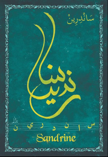 Jolie carte postale représentant le prénom français Sandrine calligraphié en arabe ainsi que son épellation lettre par lettre en arabe. Derrière la carte postale se trouve la signification du prénom. Prénom d'origine grec signifiant protectrice.