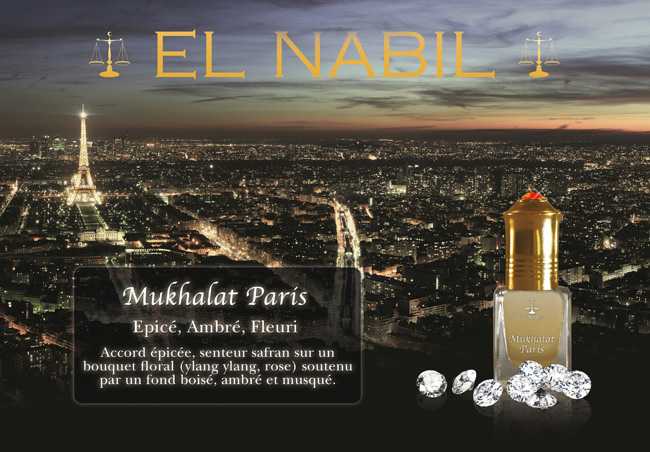 Parfum El Nabil "Mukhalat Paris" : Epicé, Ambré, Fleuri... Accord épicée, senteur safran sur un bouquet floral soutenu par un fond boisé, ambré et musqué.