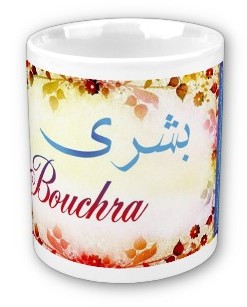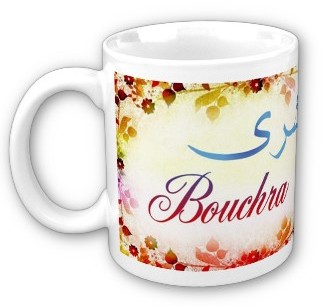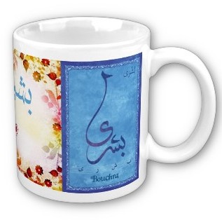 Mug avec le prénom Bouchra calligraphié en arabe (بشرى) ainsi que son épellation lettre par lettre en arabe.