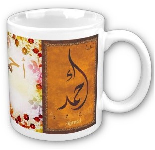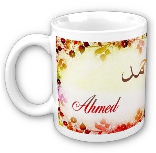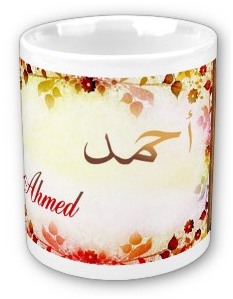 Mug avec le prénom "Ahmed" calligraphié en arabe (أحمد) ainsi que son épellation lettre par lettre en arabe.