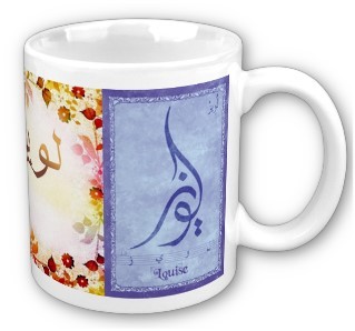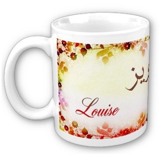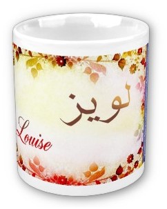 Mug avec le prénom "Louise" calligraphié en arabe (لويز) ainsi que son épellation lettre par lettre en arabe.