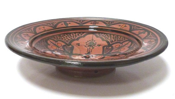 Assiette marocaine decorative en poterie emaillee peinte en rouge brique et ornee de motifs