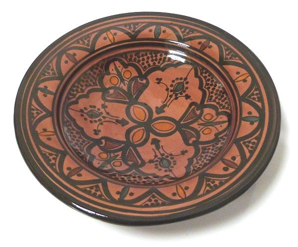 Assiette en céramique, en provenance de Marrakech (Maroc) de forme ronde, de couleur rouge brique, émaillée, décorée à la main avec de très beaux motifs traditionnels.