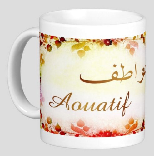 Mug avec le prénom "Aouatif" écrit en français, en arabe (عواطف) et calligraphié de façon artistique en arabe sur la partie droite.