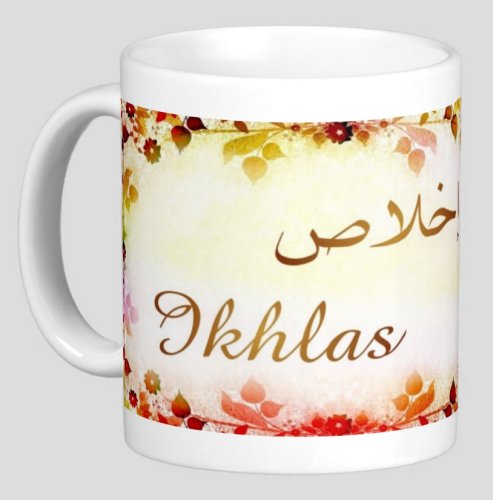 Mug avec le prénom "Ikhlas" écrit en français, en arabe (إخلاص) et calligraphié de façon artistique en arabe sur la partie droite.