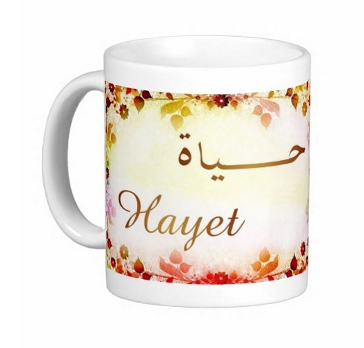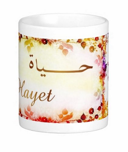 Mug avec le prénom "Hayet" écrit en français, en arabe (حياة) et calligraphié de façon artistique en arabe sur la partie droite.