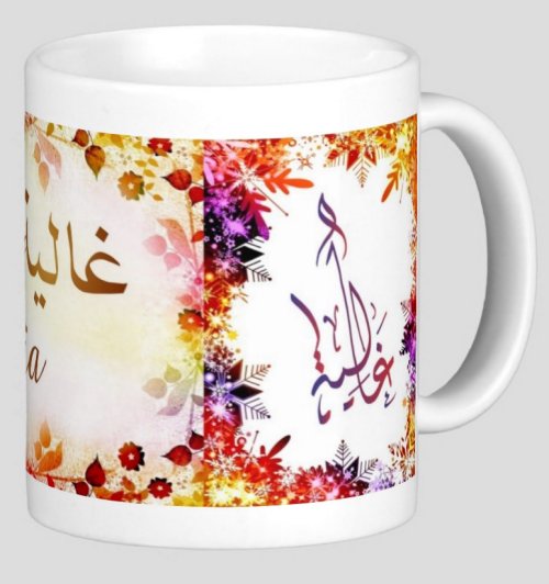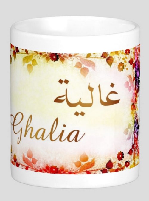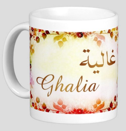 Mug avec le prénom "Ghalia" écrit en français, en arabe (غالية) et calligraphié de façon artistique en arabe sur la partie droite.