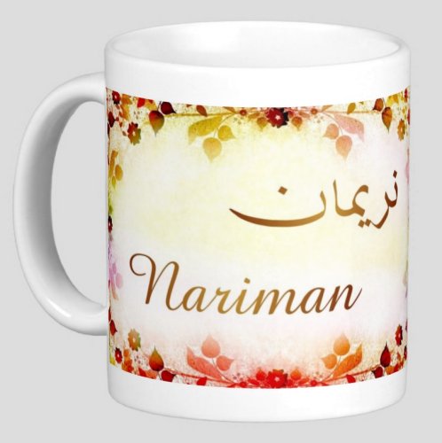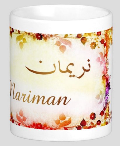 Mug avec le prénom "Nariman" écrit en français, en arabe (نرمان) et calligraphié de façon artistique en arabe sur la partie droite.