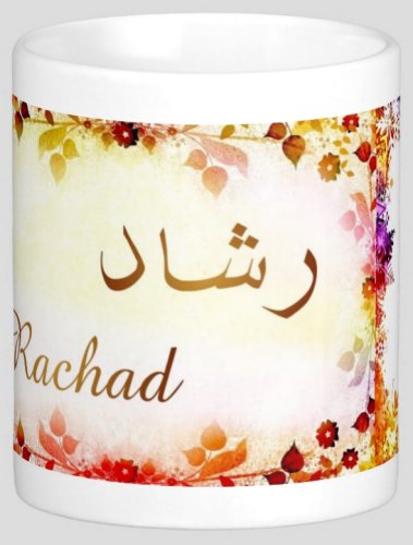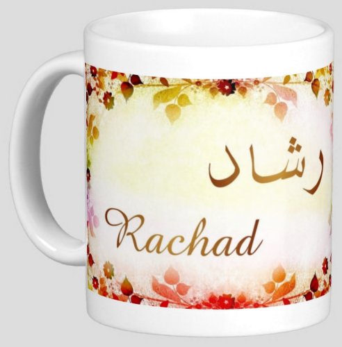Mug avec le prénom "Rachad" écrit en français, en arabe (رشاد) et calligraphié de façon artistique en arabe sur la partie droite.